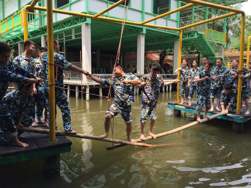 过河拆板:公司副总为公司员工树立榜样,亲身带领大家进行训练,这项训练是用两条木棍渡河,挑战难度非常高,但全员都能顺利过关,呈现出亚太员工遇难越强的精神风貌。