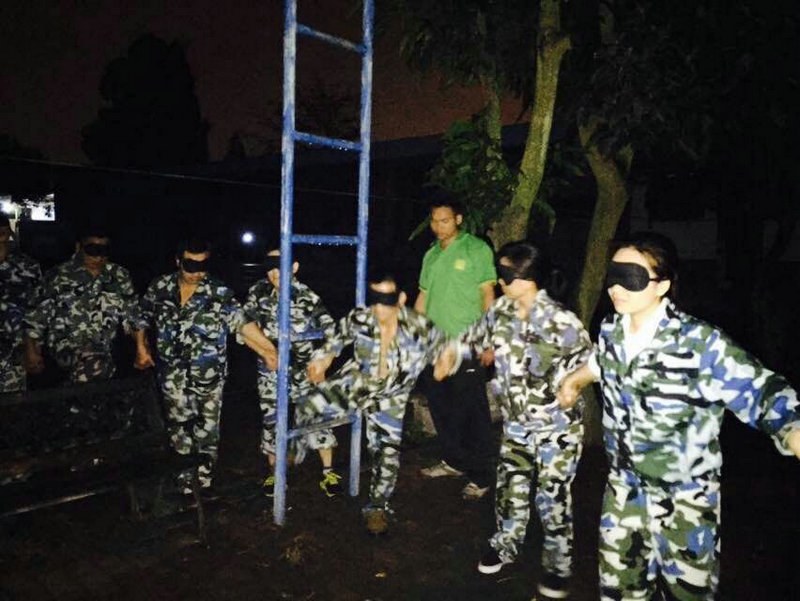 风雨人生路:在黑夜里全体学员蒙眼手牵手走过崎岖、平坦、泥泞、未知的路程。信任是人与人交往之间的基础。要学会感恩。